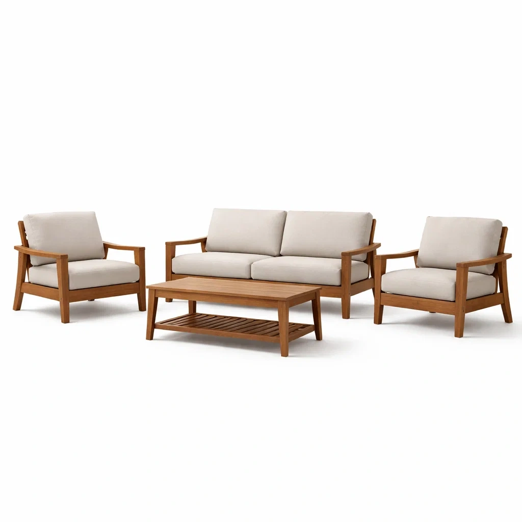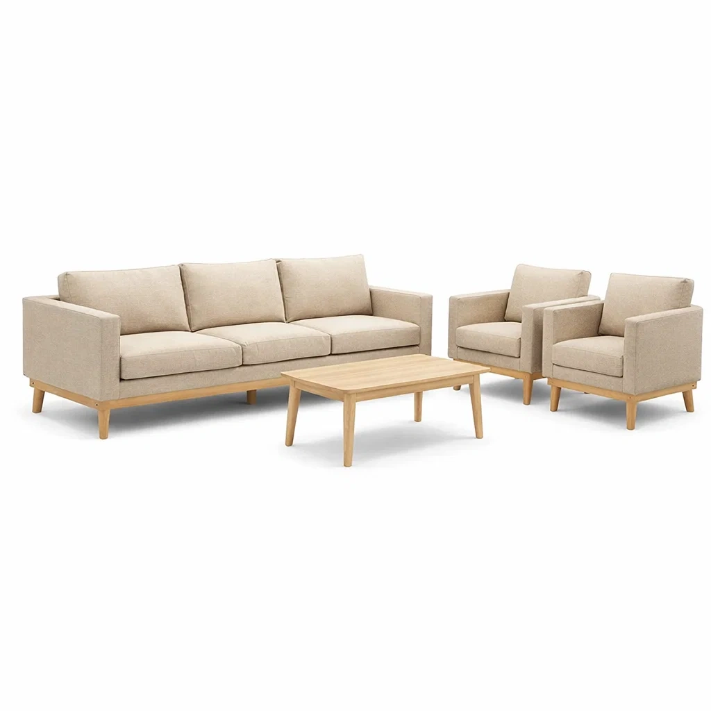 Ensemble de canapés en tissu et bois beige avec fauteuils et table basse