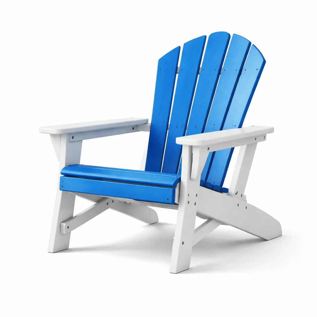 Chaise Adirondack en plastique recyclé avec des lattes bleues et une structure blanche.