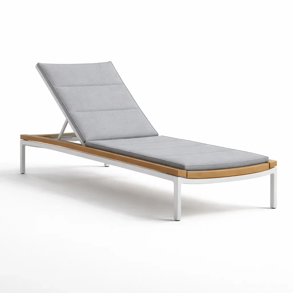 La chaise longue dispose d'un cadre en aluminium et d'une surface en bois de teck. Elle est équipée d'un coussin rembourré en mousse de polyuréthane avec une housse en polyester.
