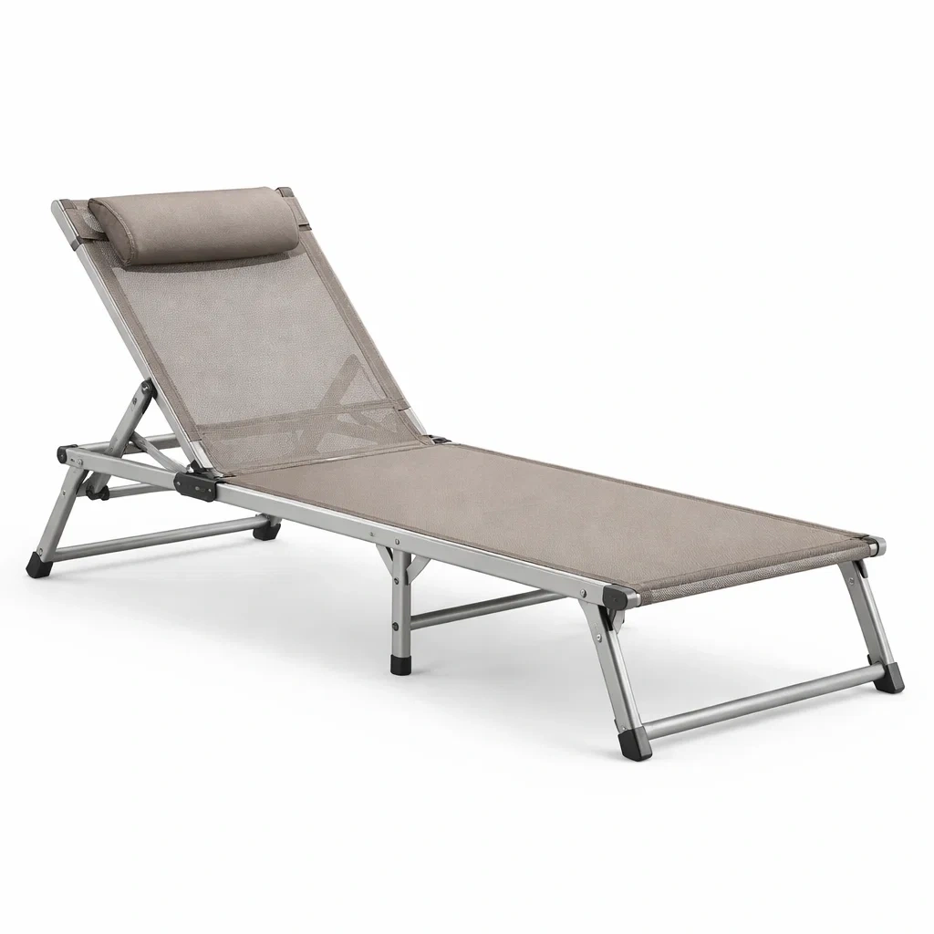 Cette chaise longue est fabriquée en aluminium avec un revêtement en textilène, offrant une durabilité élevée.
