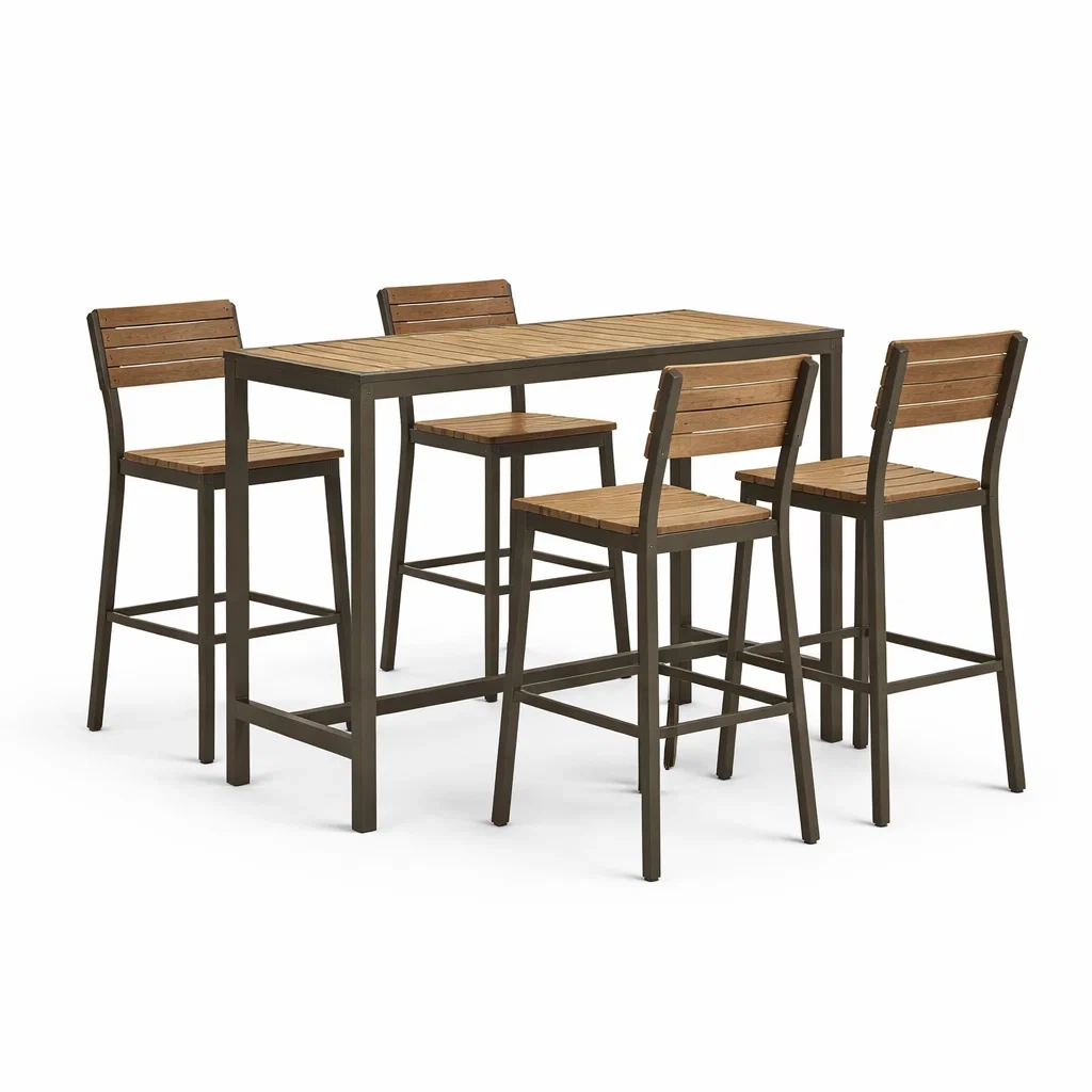 La table est fabriquée avec un cadre en acier robuste et un plateau en bois d'acacia. Chaque chaise est également construite avec un siège et un dossier en bois d'acacia. La table mesure 120 cm x 60 cm x 105 cm et chaque chaise mesure 40 cm x 35 cm x 100 cm. L'ensemble comprend une table et quatre chaises. Cet ensemble nécessite un assemblage.
