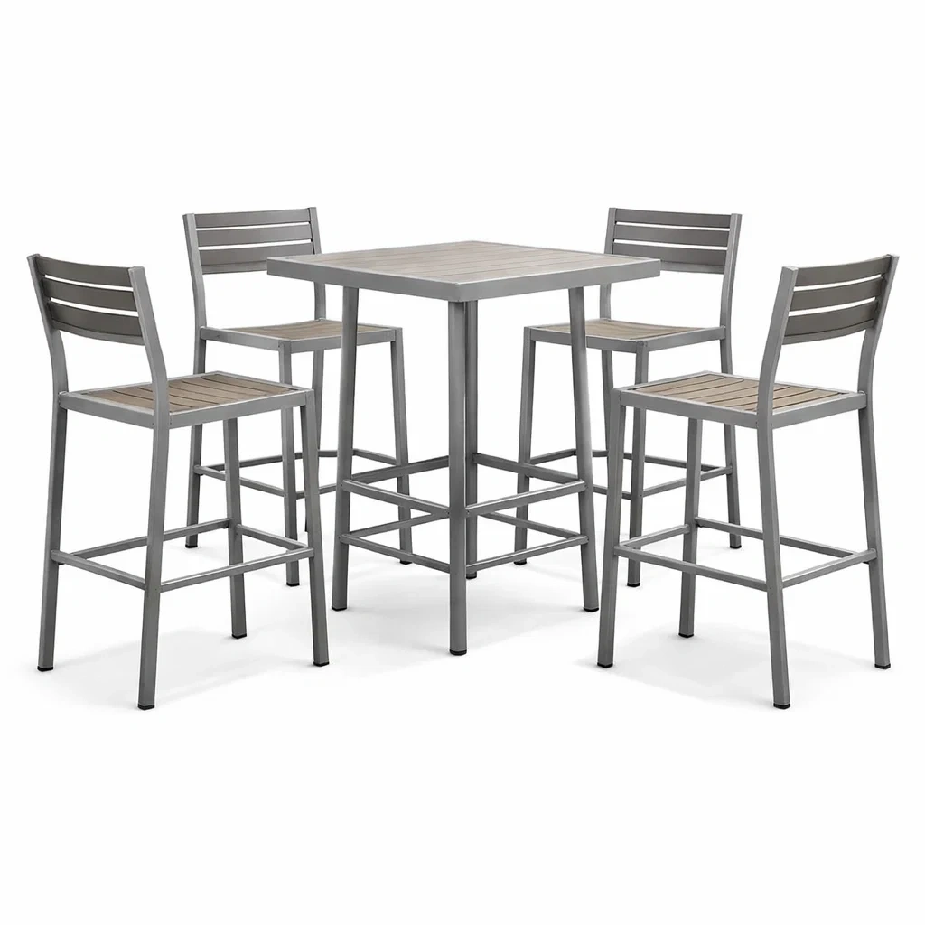 Chaises en aluminium avec assise et dossier en bois composite.