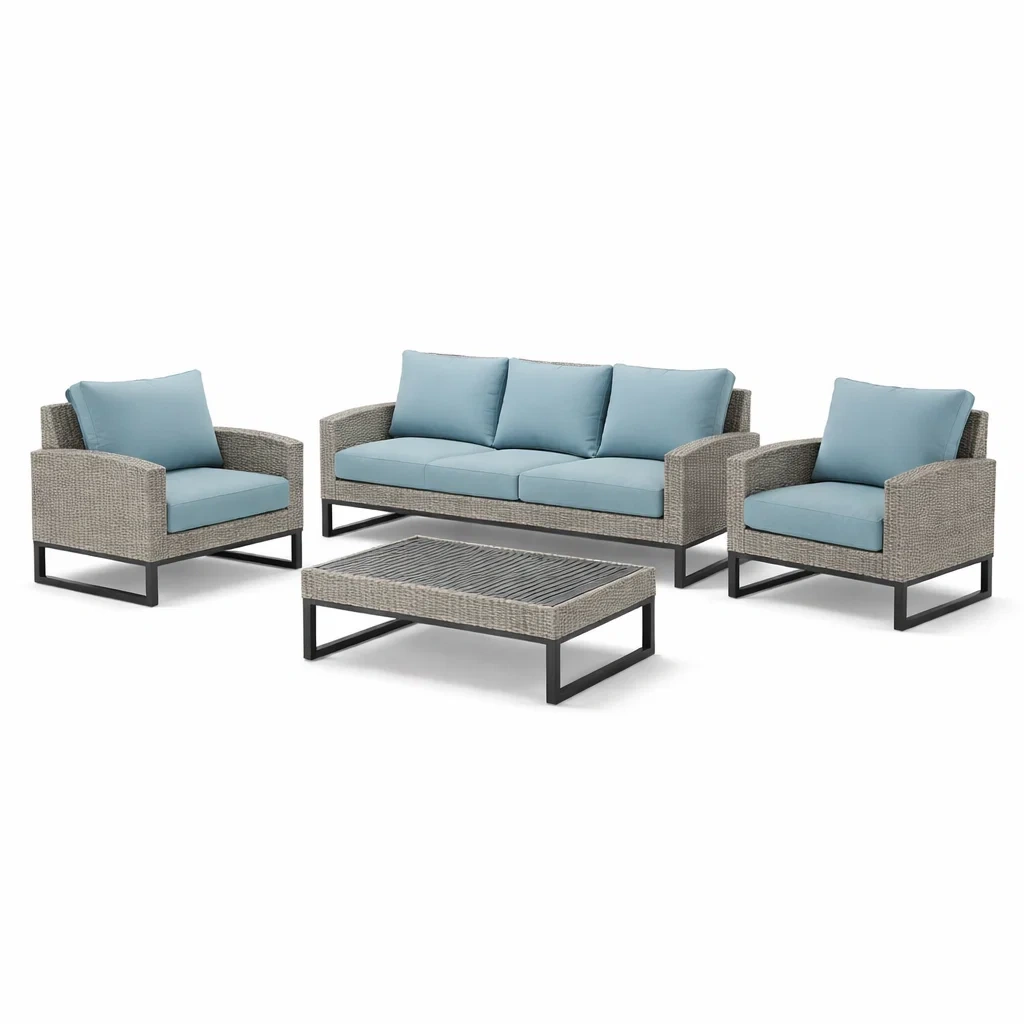 Structure en aluminium avec tressage en rotin synthétique. Les coussins sont en polyester. Couleur : Gris avec coussins bleus.