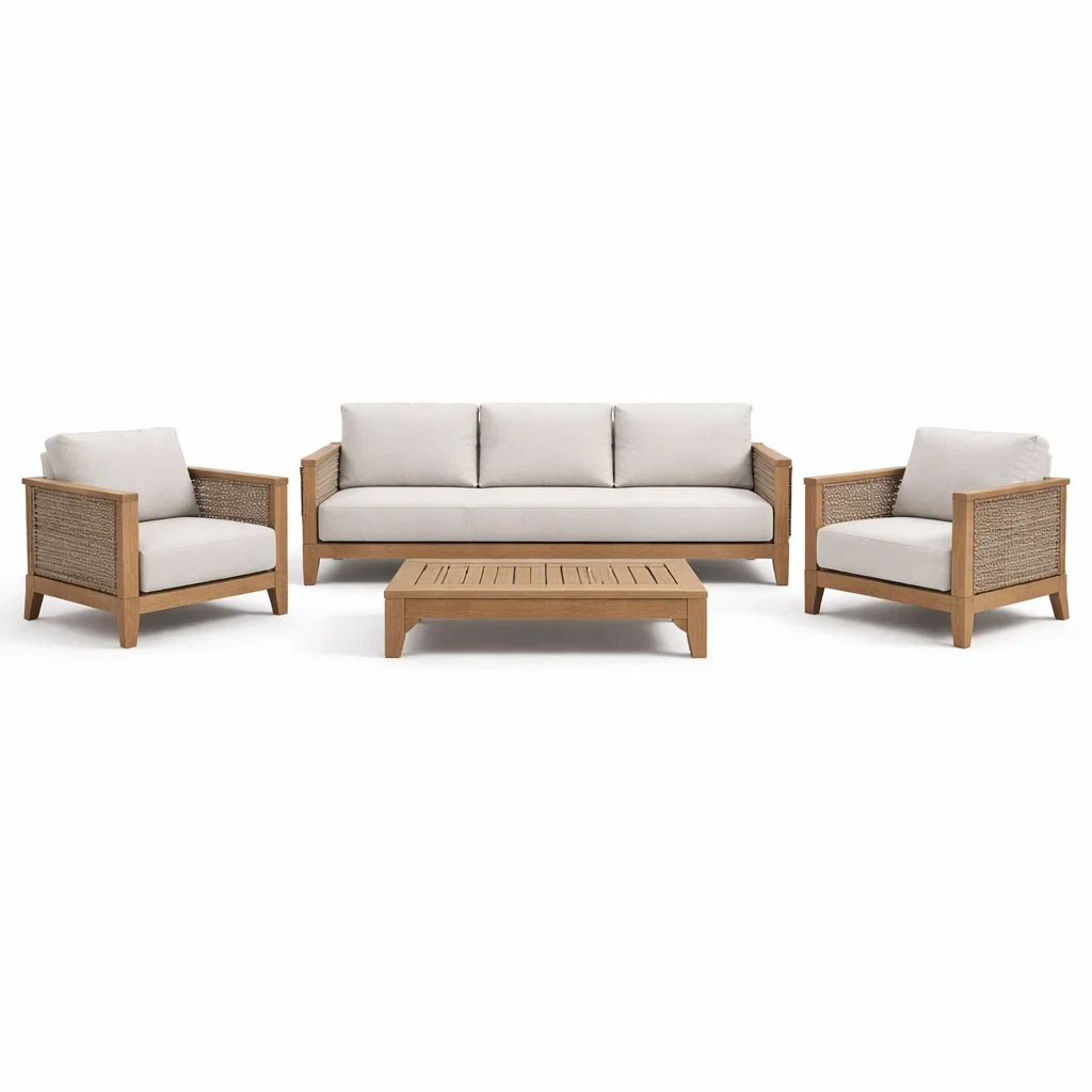 Matériaux : structures en bois, accoudoirs en rotin synthétique, coussins en polyester