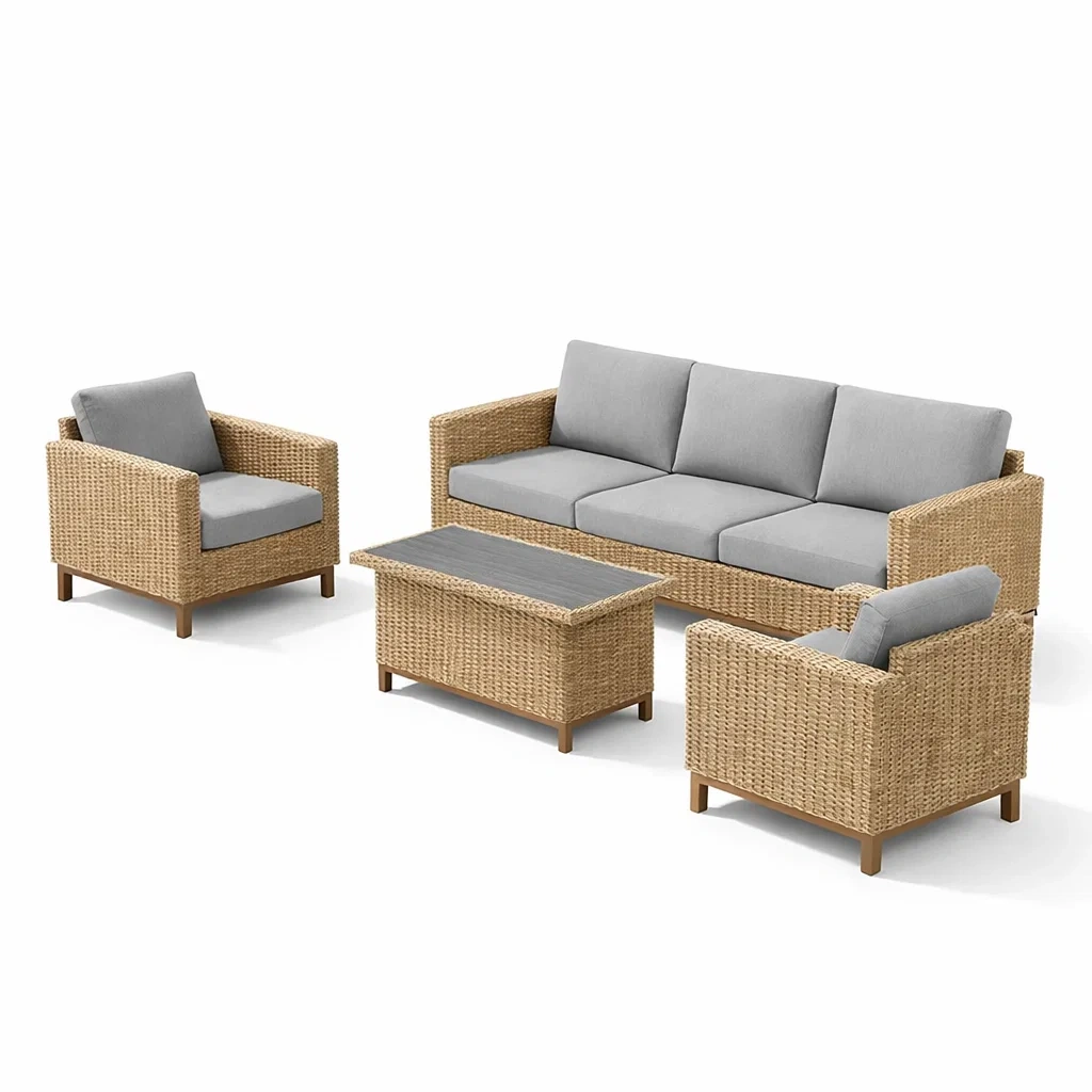 Matériaux : Structure en rotin synthétique, coussins remplis de mousse de polyuréthane, table avec plateau en verre trempé de 8 mm.