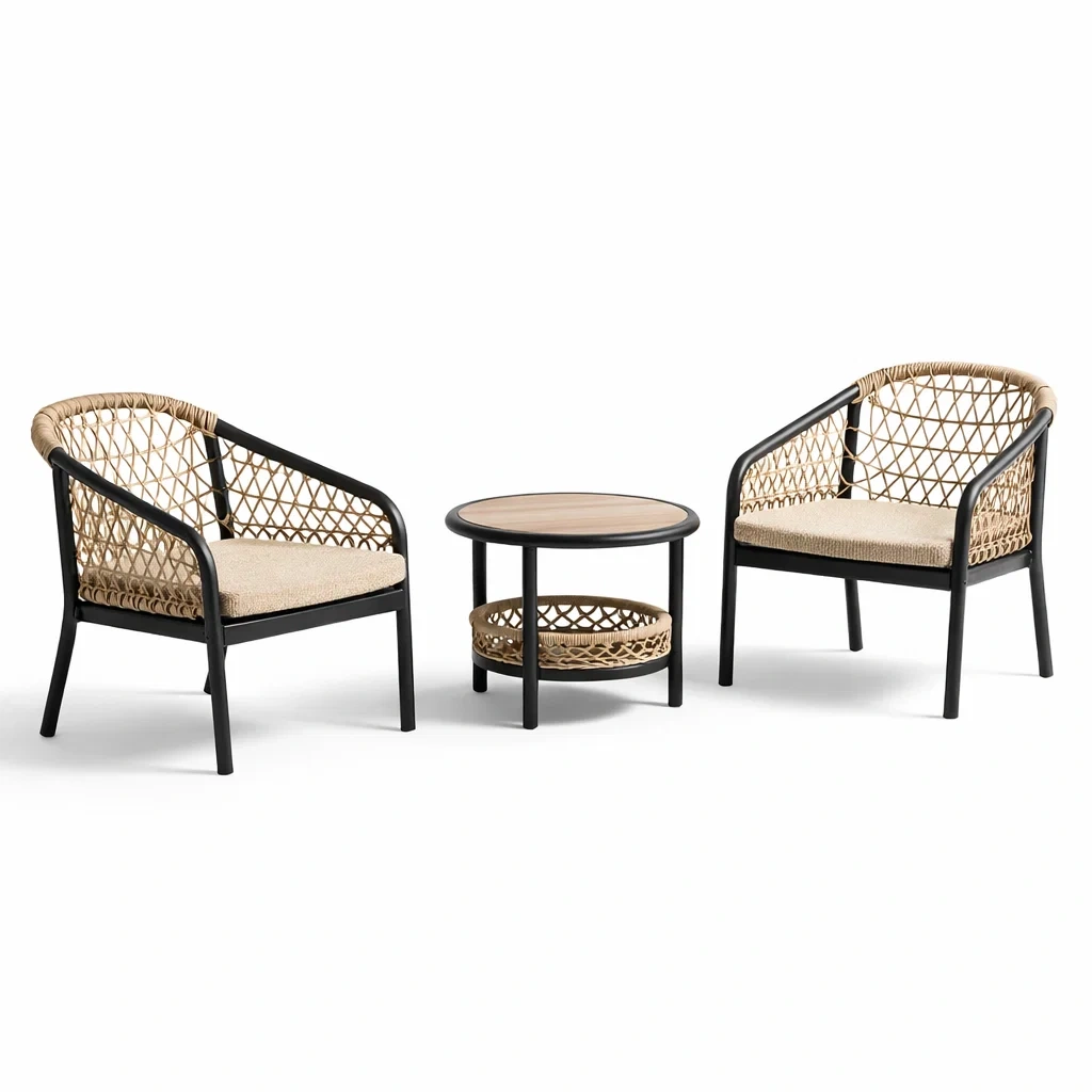 Ensemble de détente en métal et rotin noir et beige