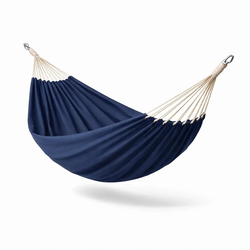 Ce hamac est fabriqué en toile de coton robuste. Il mesure 200cm par 150cm et peut supporter un poids allant jusqu'à 150kg. Conçu pour un usage intérieur et extérieur, il se suspend facilement grâce à des crochets en acier. Pensez à vérifier la fixation des crochets avant chaque utilisation.